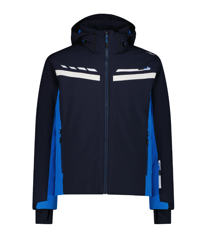 CMP men’s ski jacket made from 4-way stretch fabric with Feel Warm Flat padding, designed to offer thermal comfort, lightness and maximum freedom of movement during sports. The Clima Protect system, with a waterproof and breathable membrane, together with fully taped seams, guarantees total protection from the wind, snow and humidity, even in the most demanding conditions. The garment features a detachable hood, adjustable Lycra cuffs, a front zip with windproof flap and a drawstring hem for an adjustable and functional fit. The organisation of the spaces is optimal thanks to the five pockets: one horizontal breast pocket, two zipped side pockets, one on the wrist for your ski pass and one inside for personal items. The clean and sporty colour-block design completes a jacket that has been designed for people looking for elevated technical performance without sacrificing style on the slopes.