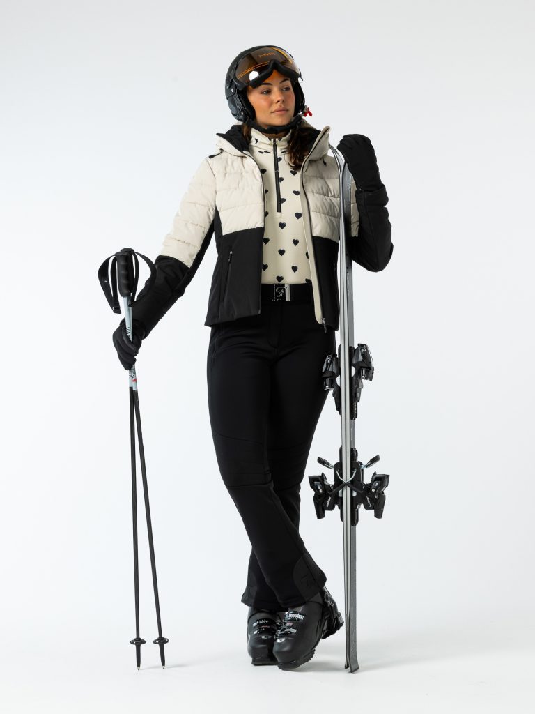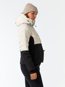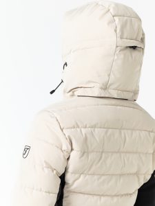 Dit waterafstotende, ademende jack met gequilte bovenkant heeft een zachte vulling en de voering aan de rugkant is van mesh. Deze fijne jas heeft een mouwzakje voor je skipasje, een zak van mesh voor je skibril, een afritsbare capuchon en een uitneembare sneeuwvanger.